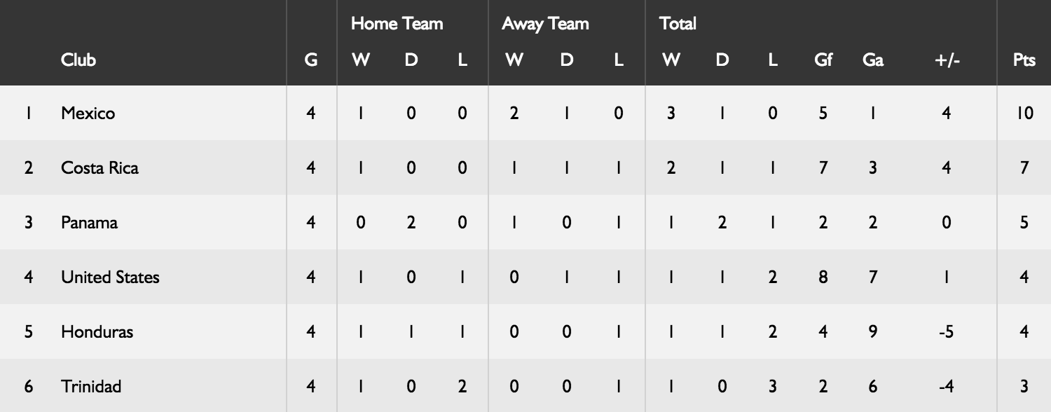 After the 6-0 thrashing of Honduras on March 24th and the draw in Panama last Tuesday, the U.S. moved from the bottom of the Hex standings to 4th, with just one point separating them from Panama in 3rd place. Mexico (10 points) and Costa Rica (7) head up the standings with 6 matches remaining.