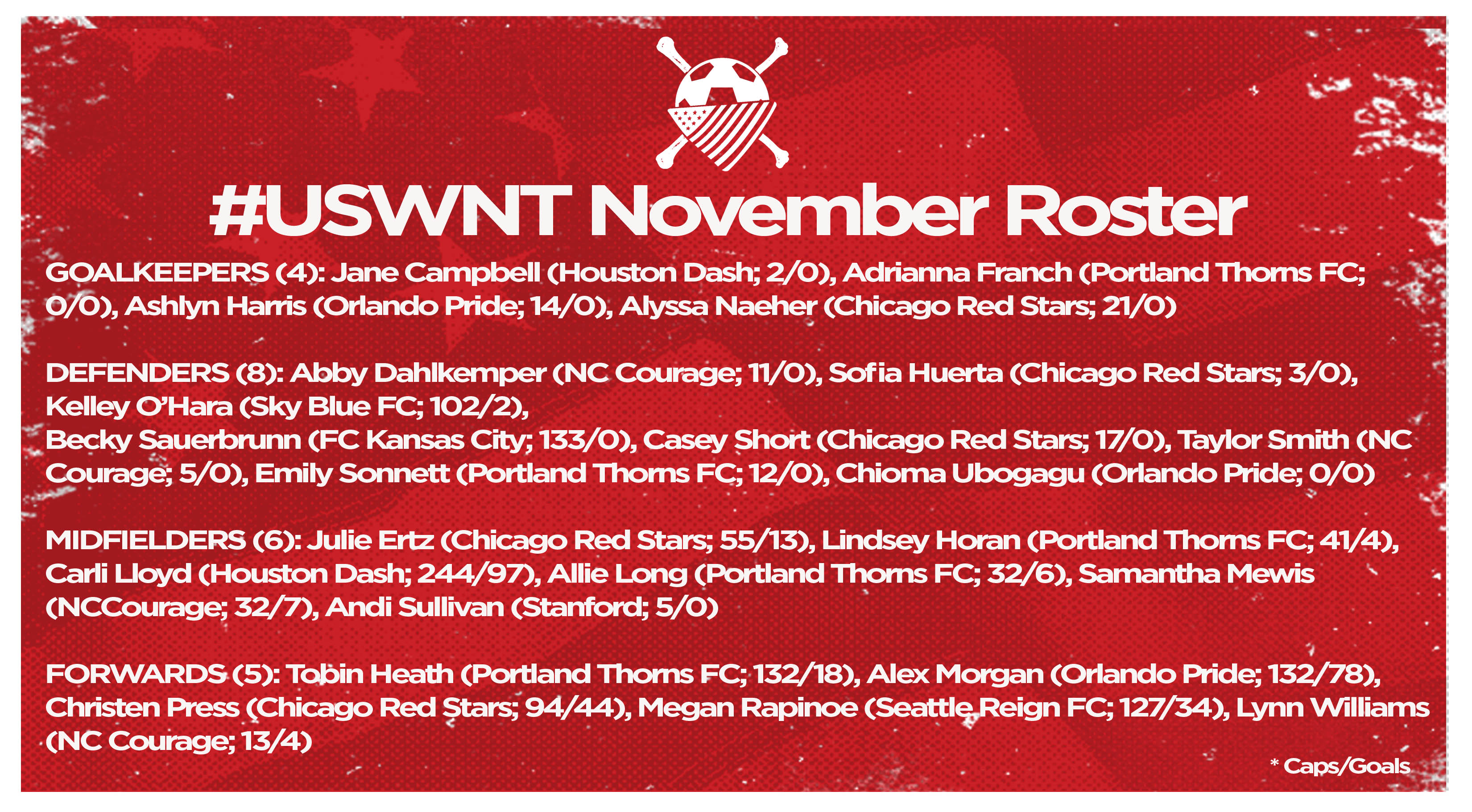 - Jill Ellis has named her 23-women roster, which will be looking to finish the year strong in two friendlies against Canada this week (Tickets available here). Adrianna Franch, Emily Sonnett and Chioma Ubogagu make up the new additions since the team dominated two matches against South Korea last month. Crystal Dunn (club obligations), Mallory Pugh (injury), Morgan Brian (injury) and Rose Lavelle (injury) will miss out. Click below to see the full roster below.
